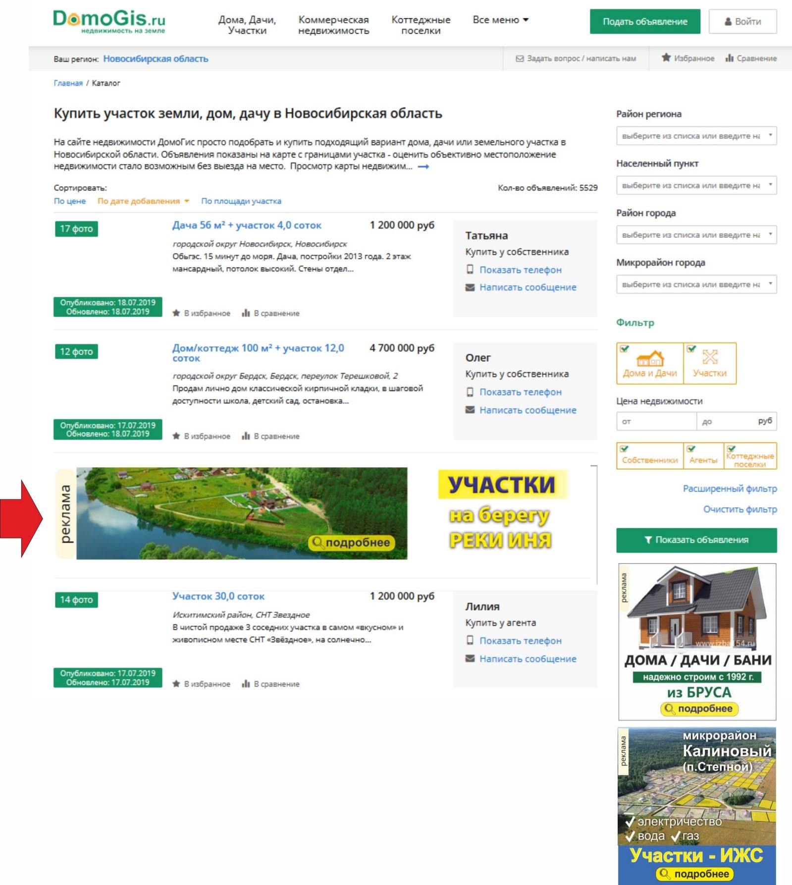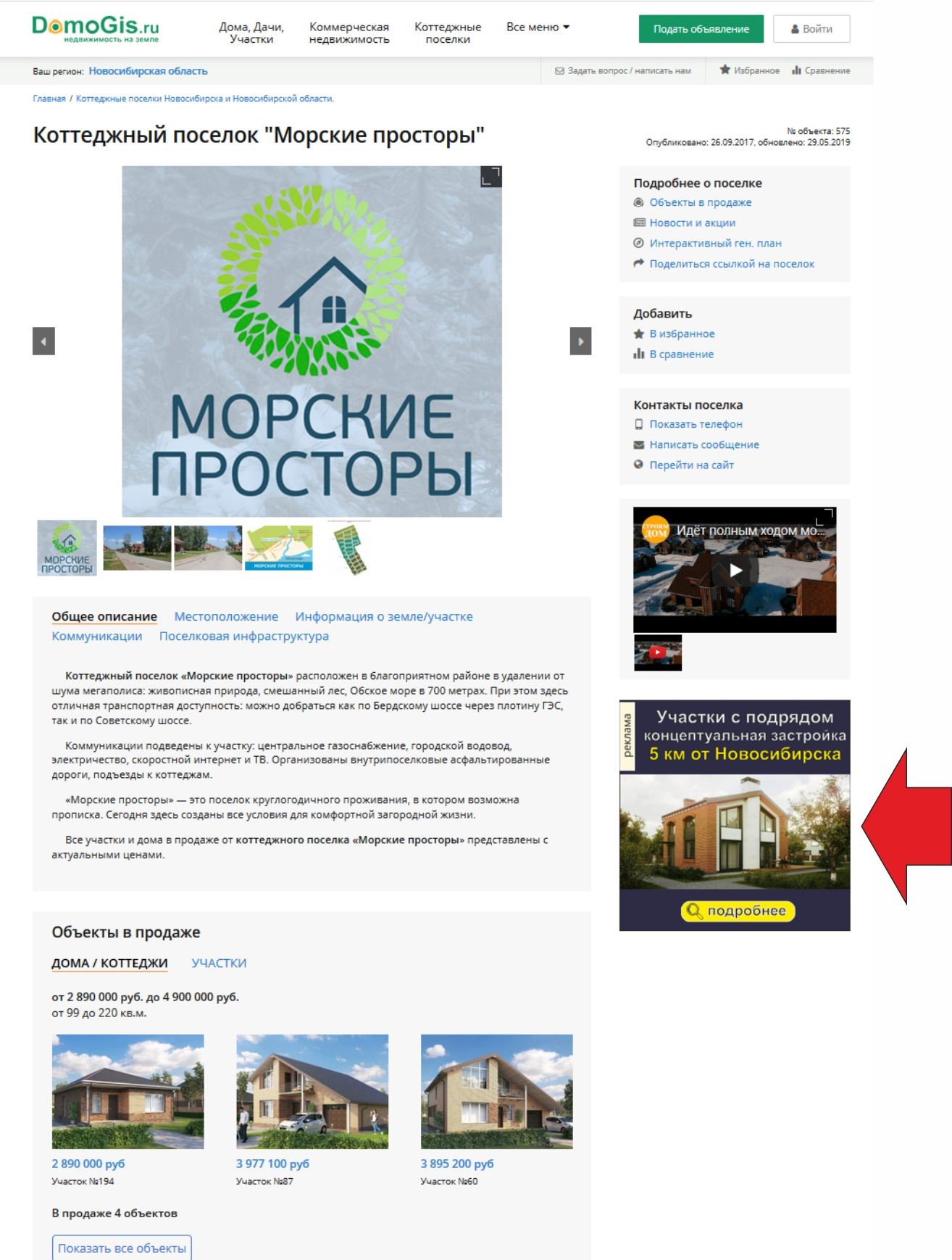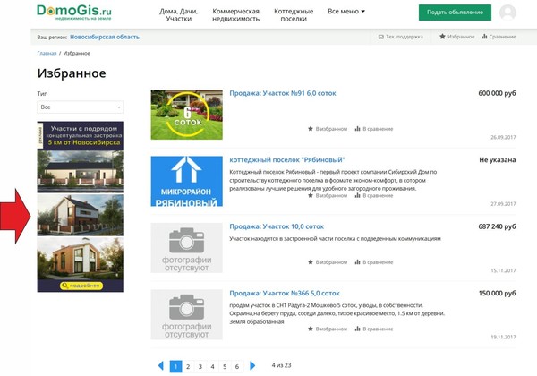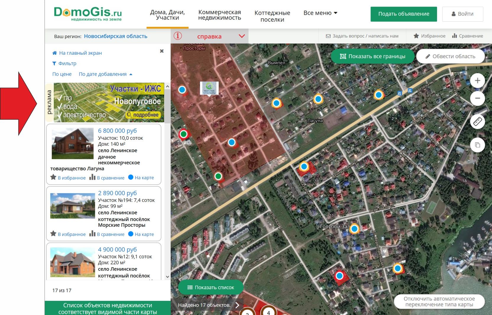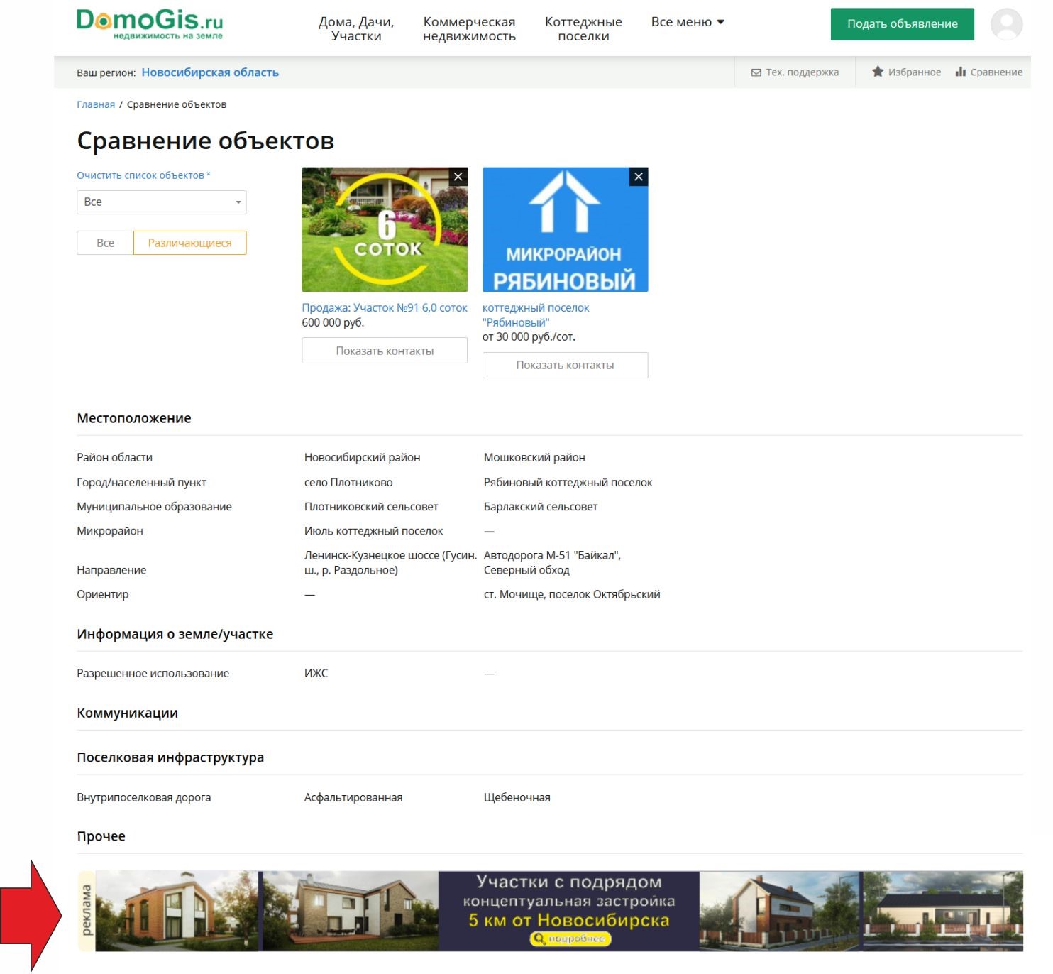 Рекламные баннеры могут быть размещены на разных страницах сайта ДомГис: в каталогах объектов, поселков; на страницах объектов, поселков; на страницах избранное и сравнение; на странице карта.